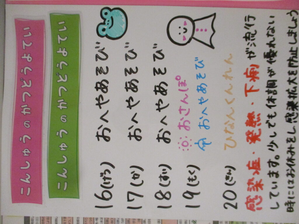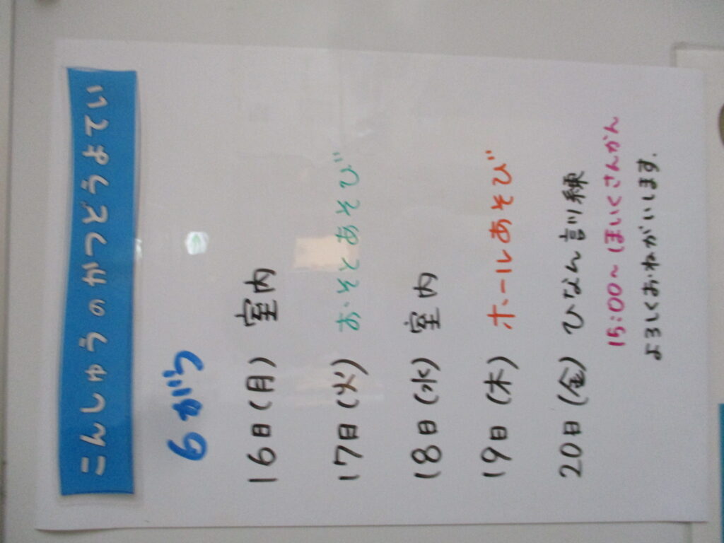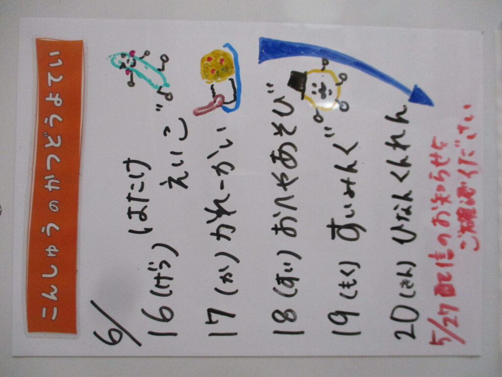◆◇1週間の予定◇◆6/16(月)~6/20(金) 2025/06/14 ※こちらに記載の予定は、天候や都合により変更になる場合がございます。ご承知おきください。 ※コドモンで予定をご確認いただけます。あわせてご活用ください。 ======================================== 【ぽかぽか】 【きらきら】 【わくC】 【わくB】 【わくA】