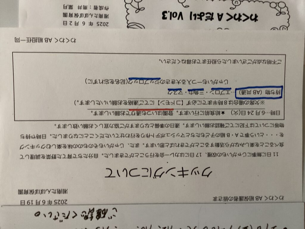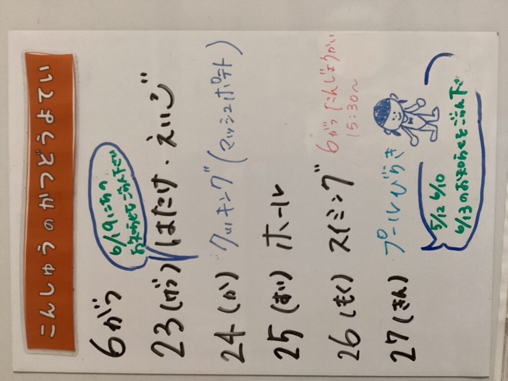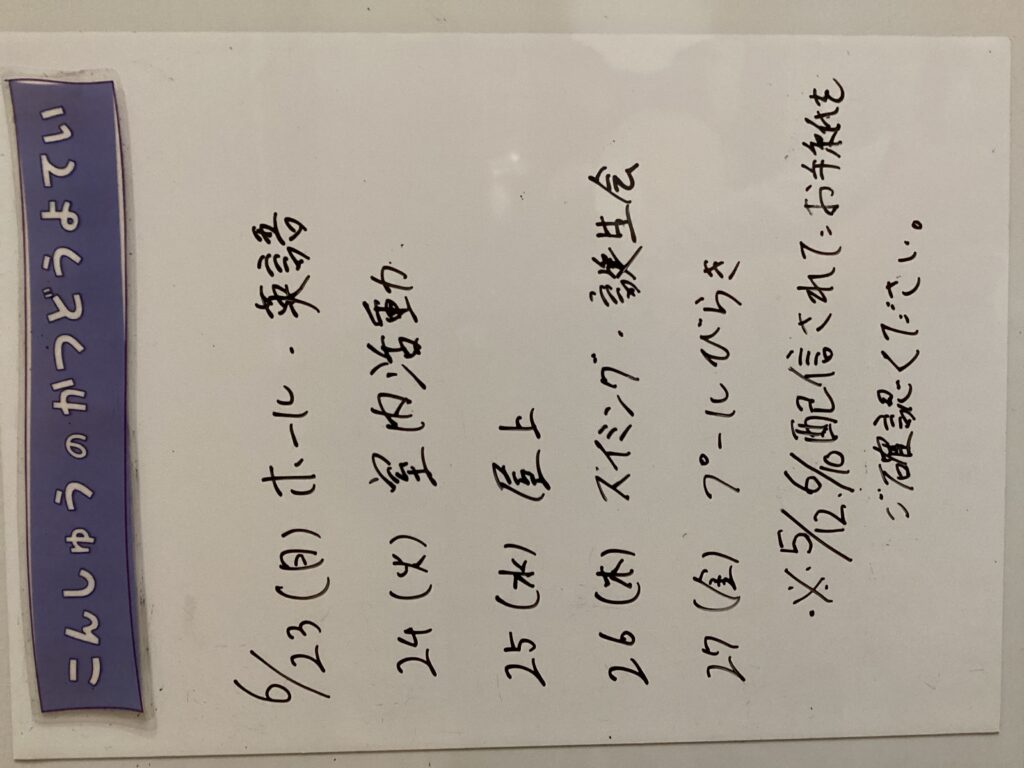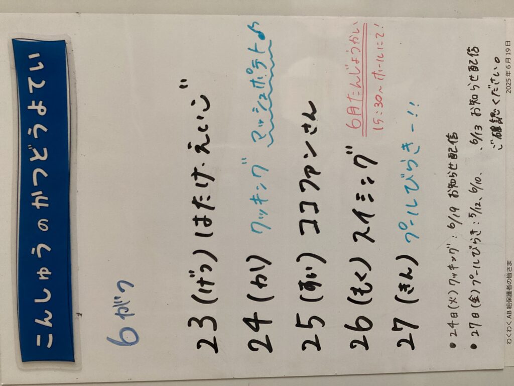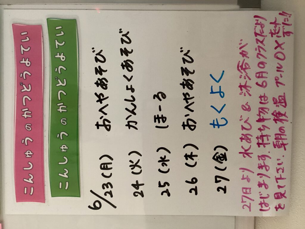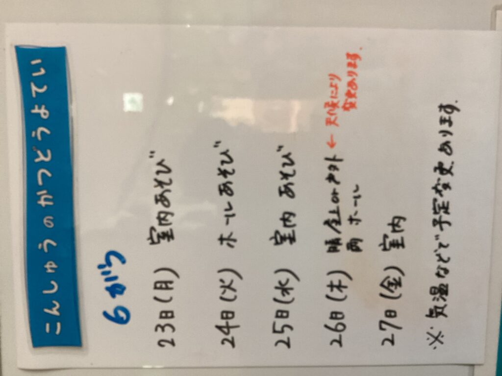 ◆◇1週間の予定◇◆6/23(月)~6/27(金) 2025/06/23 ※こちらに記載の予定は、天候や都合により変更になる場合がございます。ご承知おきください。 ※コドモンで予定をご確認いただけます。あわせてご活用ください。 =================== 【ぽかぽか】 —————————————- 【きらきら】 —————————————- 【わくC】 —————————————- 【わくB】 —————————————- 【わくA】