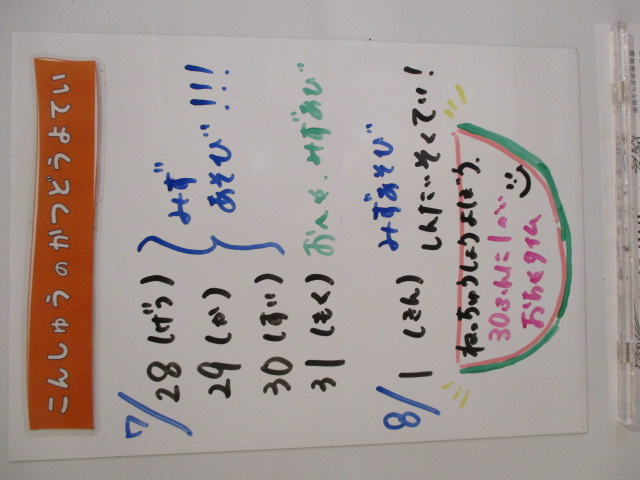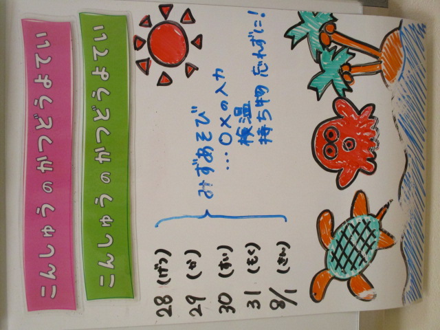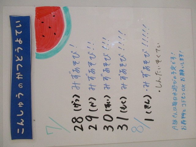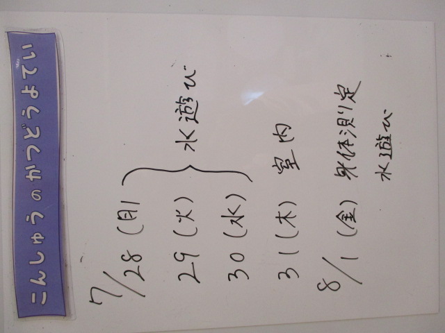 ◆◇1週間の予定◇◆7/28(月)~8/1(金) 2025/07/26 ※こちらに記載の予定は、天候や都合により変更になる場合がございます。ご承知おきください。 ※コドモンで予定をご確認いただけます。あわせてご活用ください。 ======================= 【ぽかぽか】 【きらきら】 【準備中】 【わくわくC】 【わくわくB】 【わくわくA】