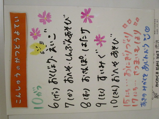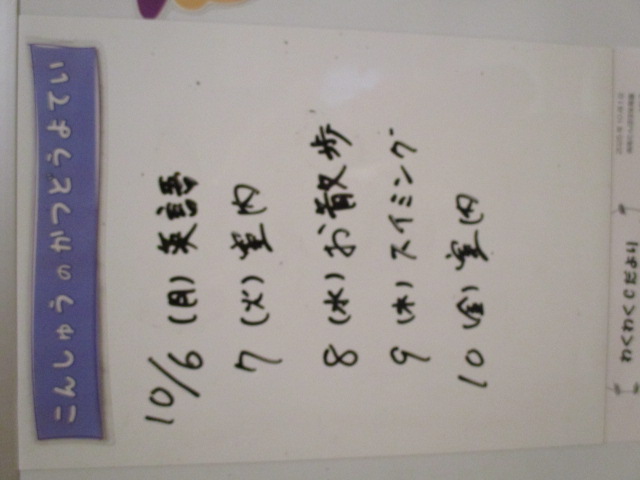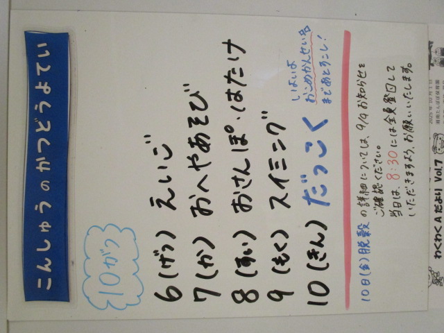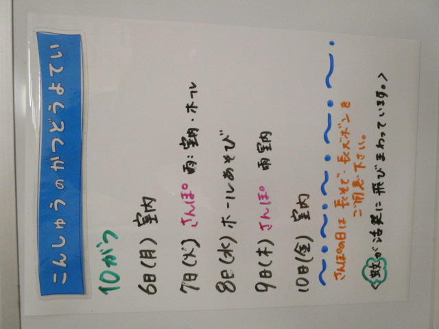 ◆◇1週間の予定◇◆10/6(月)~10/10(金) 2025/10/06 ※こちらに記載の予定は、天候や都合により変更になる場合がございます。ご承知おきください。 ※コドモンで予定をご確認いただけます。あわせてご活用ください。 ============================= 【ぽかぽか】 【きらきら】 【わくわくC】 【わくわくB】 【わくわくA】