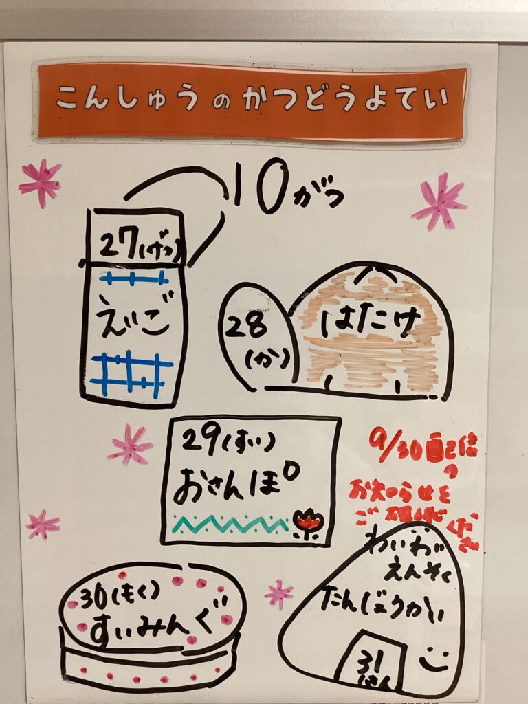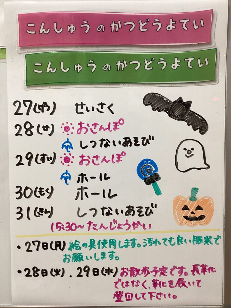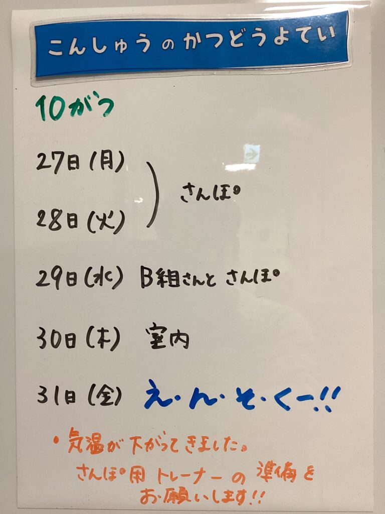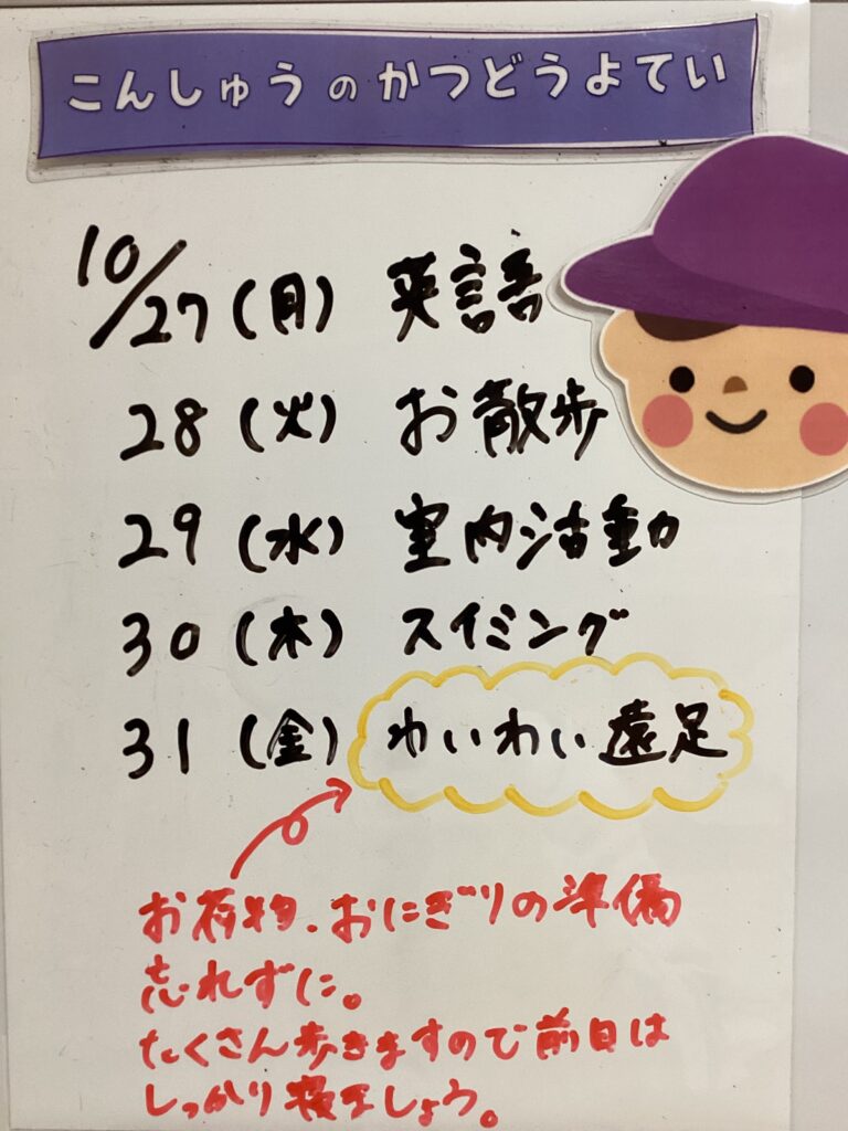 ◆◇1週間の予定◇◆10/27(月)~10/31(金) 2025/10/25 ※こちらに記載の予定は、天候や都合により変更になる場合がございます。ご承知おきください。 ※コドモンで予定をご確認いただけます。あわせてご活用ください。 =================== 【ぽかぽか】 —————————————- 【きらきら】 —————————————- 【わくC】 —————————————- 【わくB】 —————————————- 【わくA】