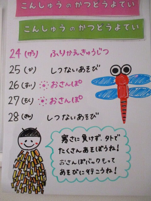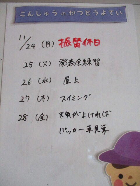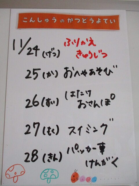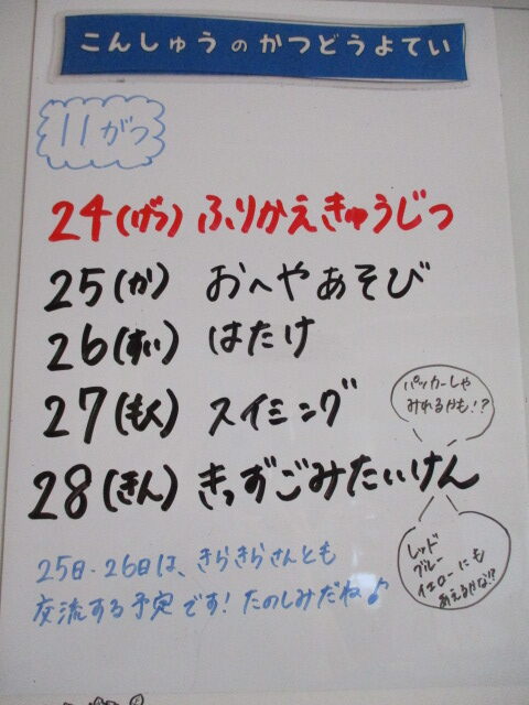 ◆◇1週間の予定◇◆11/25(火)〜11/28(金) 2025/11/25 ※こちらに記載の予定は、天候や都合により変更になる場合がございます。ご承知おきください。 ※コドモンで予定をご確認いただけます。あわせてご活用ください。 =================== 【ぽかぽか】 【きらきら】 【わくわくC】 【わくわくB】 【わくわくA】