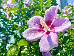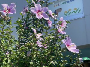 このかわいらしいお花が気になるたんぽぽキッズ多数!! よく「ハイビスカスですか?」と聞かれますが、これ『 ムクゲ 』と言います。梅雨~夏のあいだじゅう華やかな大輪の花を咲かせる、日本の夏の花。” 東洋のハイビスカス ” とも呼ばれているんだとか。ハイビスカスとの違い、花言葉などなど、気になる方はぜひネット検索してみてください。