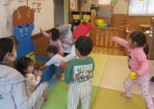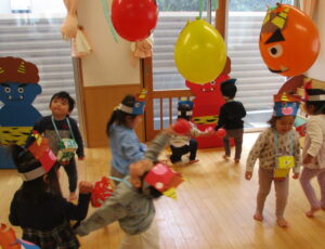 集会後は乳児幼児にわかれ、【乳児クラス】お部屋でカラーボール 【幼児クラス】ホールで豆・・を投げて鬼退治をしました!