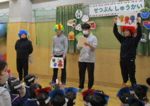 今日は節分集会を行いました。鬼が登場すると大喜びしたり、ビックリするお友だちがたくさん!!<節分の由来>を聞いたり、<鬼のパンツ当てクイズ>を行ったりして、楽しく過ごし、最後はみんなで『鬼のパンツ』を踊って鬼さんたちとお別れしました♪