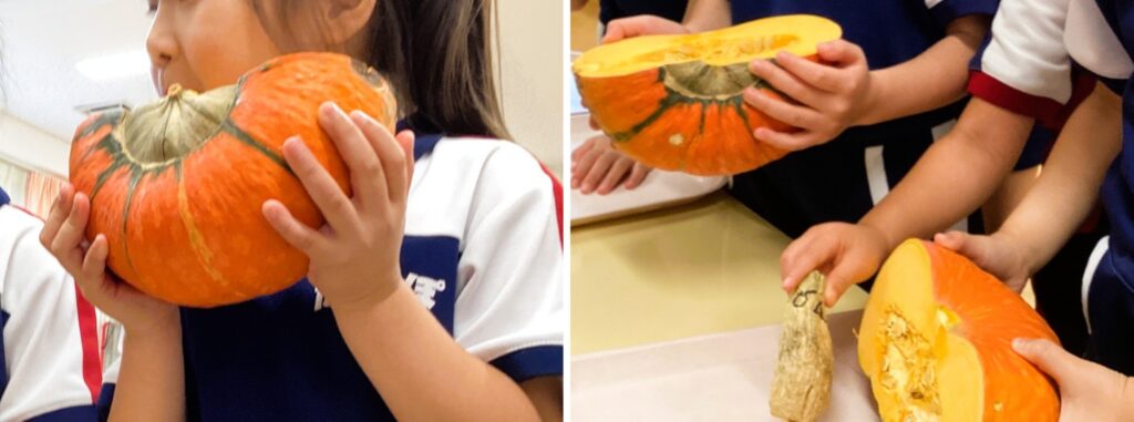 ▼調理前の観察タイム!半分に切ったかぼちゃの断面や香りをじっくり観察。オレンジ色と香りに大興奮!