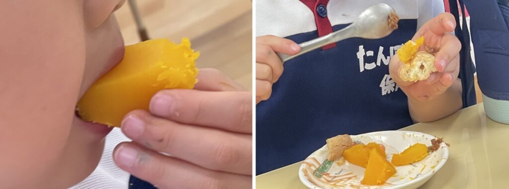 「どうやって食べよう?」と相談すると、子どもたちからは元気いっぱいの声が。