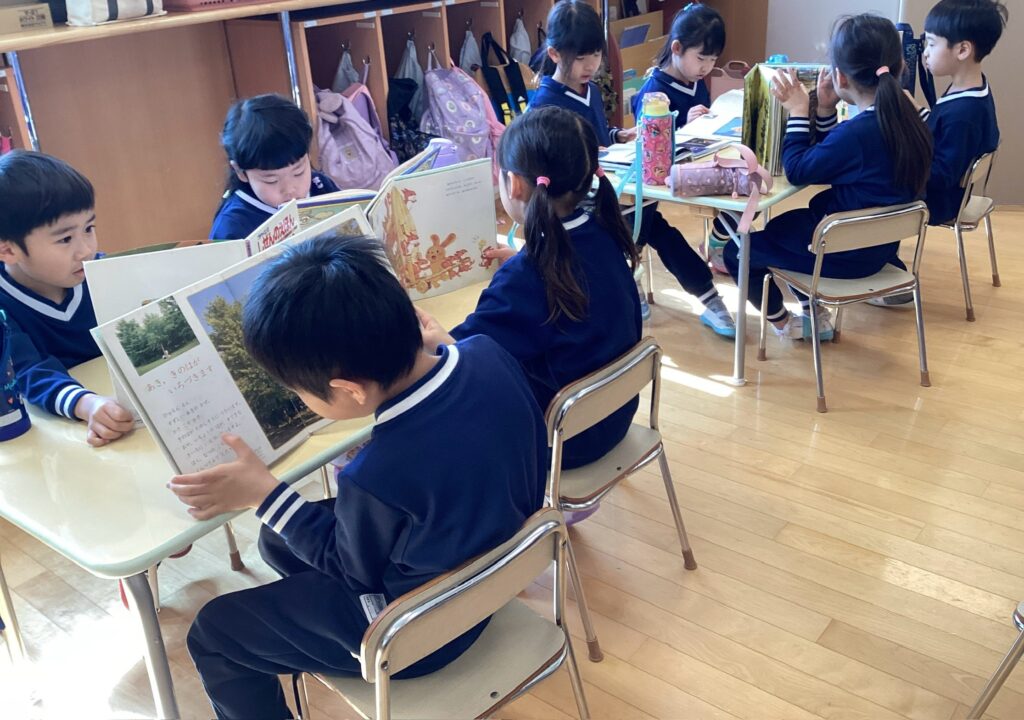 ▼保育園に戻って『読書タイム』。かっこいい小学生に憧れて、いつも以上に集中し、まるで小学生みたいなA組さんでした☆