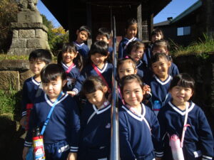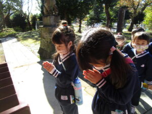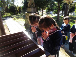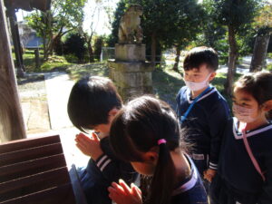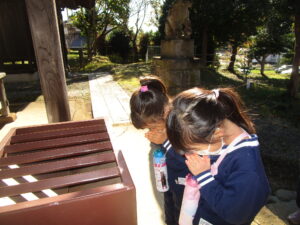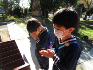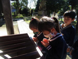 気持ちの良い秋晴れの今日。A組さんは片道30分かけ、昨日雨天のため延期となった七五三詣りのため、諏訪神社へ出かけました。二回の礼と二回の拍手をし、●お名前 ●感謝の気持ち(元気にすごせています) ●お願いごと・・・を心の中でお話します。最後に一礼。となりに『なかむら公園』が見え、後ろ髪を引かれましたが、保育園にむけて出発しました。