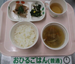 ご飯、お好み焼きハンバーグ、ほうれん草としめじのソテー、根菜汁