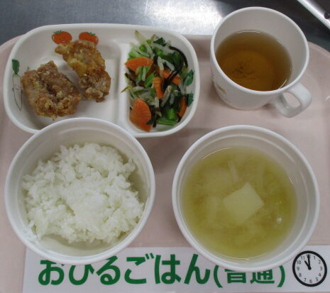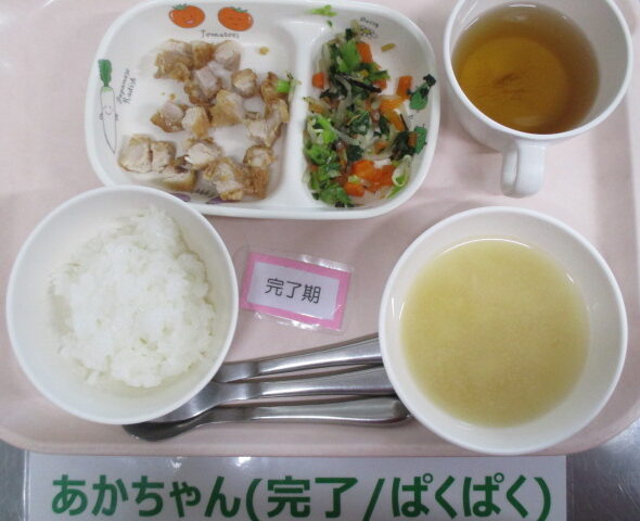 ★2/18(水)今日の給食・おやつ★ 2026/02/18 ◆◆◆給 食◆◆◆ ごはん 鶏のから揚げ 小松菜の塩昆布和え さつま芋と玉ねぎの味噌汁 ————————————— ◇◇◇おやつ◇◇◇ 牛乳 もやしのチヂミ ================================ ★離乳食のメニュー★ (※完了期食・・軟飯+幼児メニューに同じ) ◆◆◆給 食◆◆◆ <後期食> ※提供なし ◇◇◇おやつ◇◇◇ ※提供なし