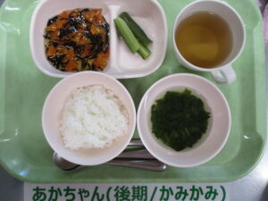 【後期食】軟飯、ひじきと人参の煮物、きゅうりスティック、ほうれん草の味噌汁