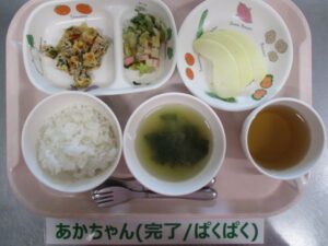 【完了食】軟飯、和風オムレツ、キャベツの磯香和え、ほうれん草と玉ねぎの味噌汁、りんご