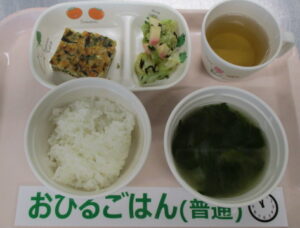 ご飯、和風オムレツ、キャベツの磯香和え、ほうれん草と玉ねぎの味噌汁、りんご