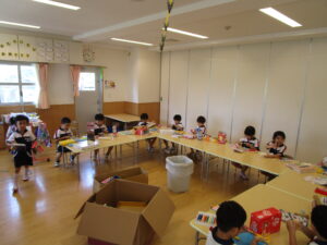 そんな中、今日はプール遊びを行ったあと、子どもたちのスキな「空き箱製作」を行いました。