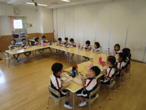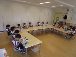 ▼今日は、久しぶりに全員が揃いました。普段とは違う形での給食タ~イム(^_^)v