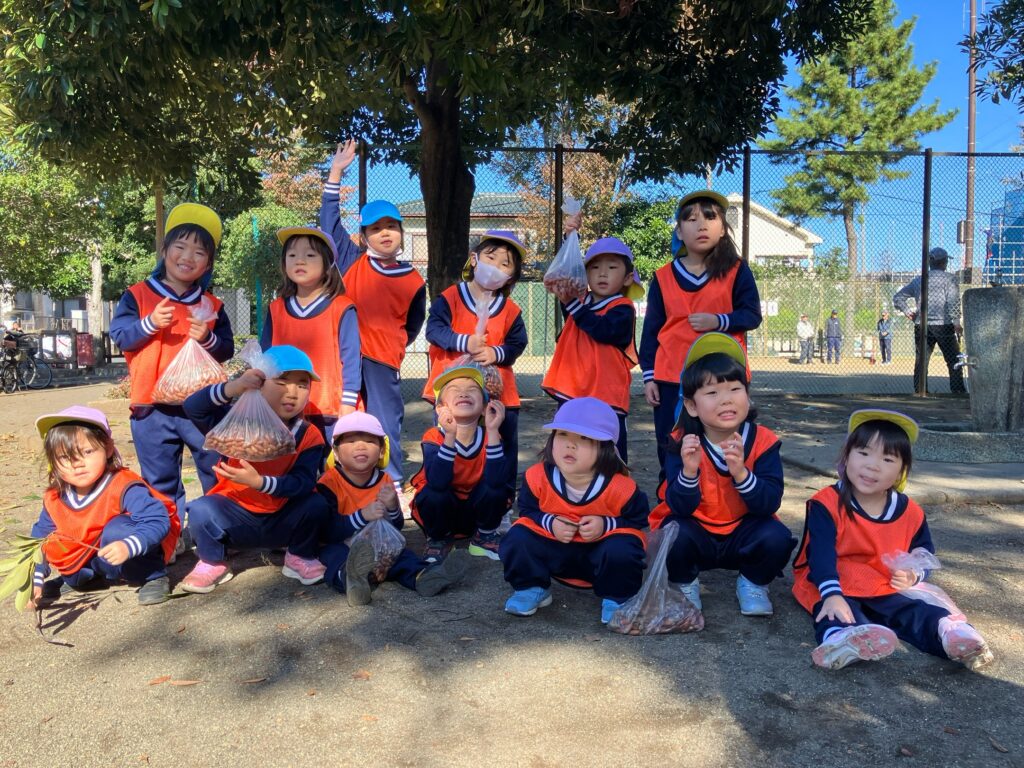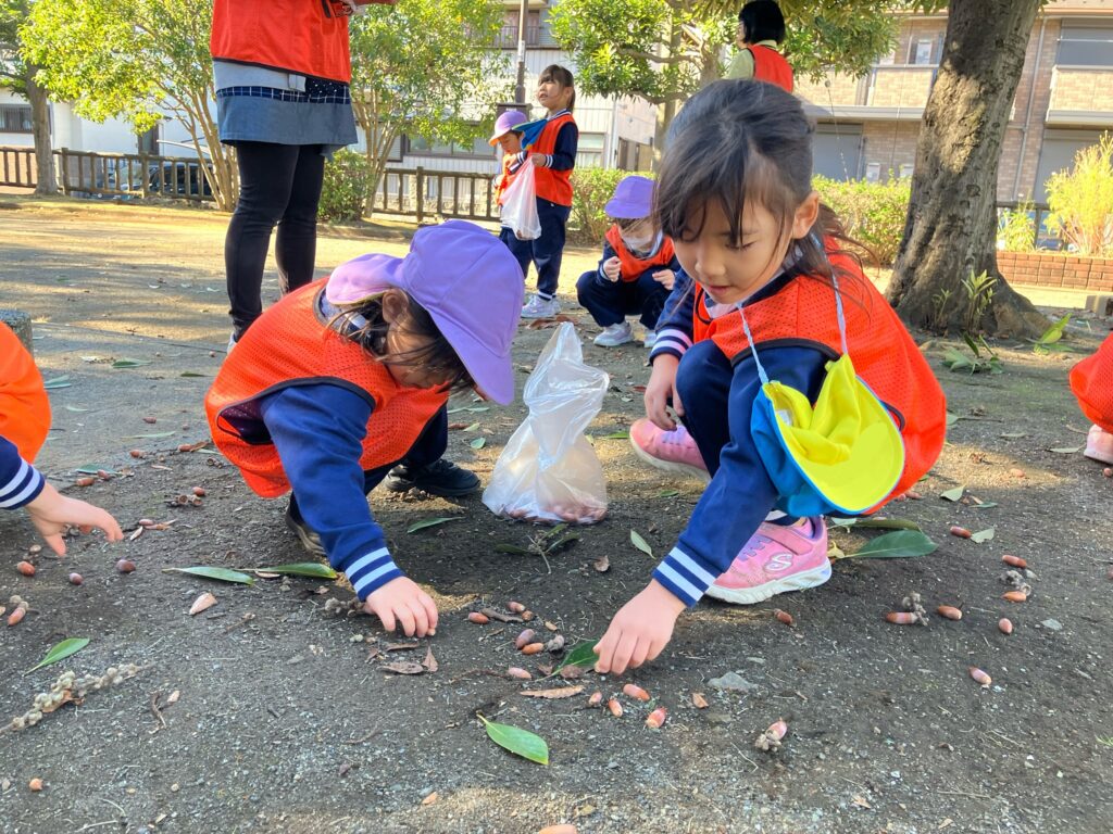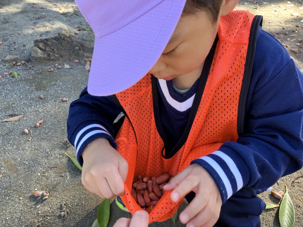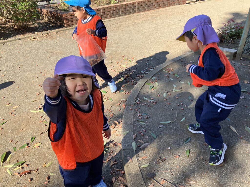 「あったよー!」「こっちもー!」とかわいい声を響かせ、無我夢中で拾うそばで、地域の方が木を揺らしてどんぐりを落としてくれたり、松ぼっくりを渡してくれたり…。優しさにあふれる時間でした。