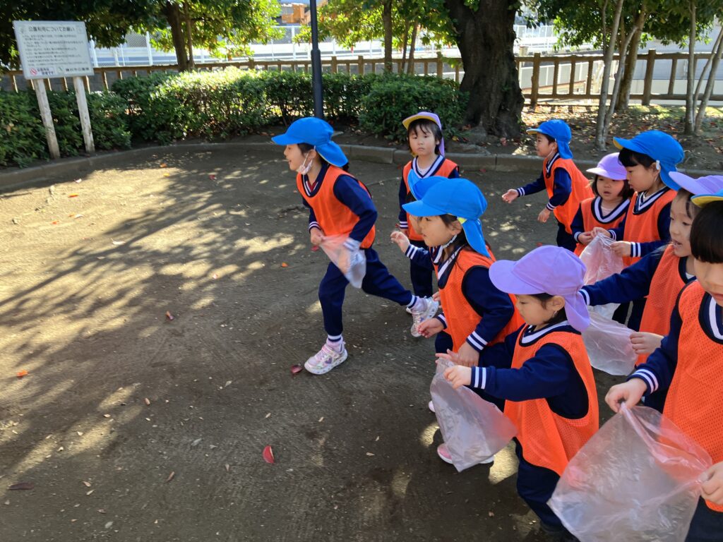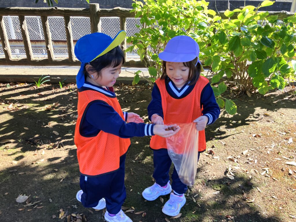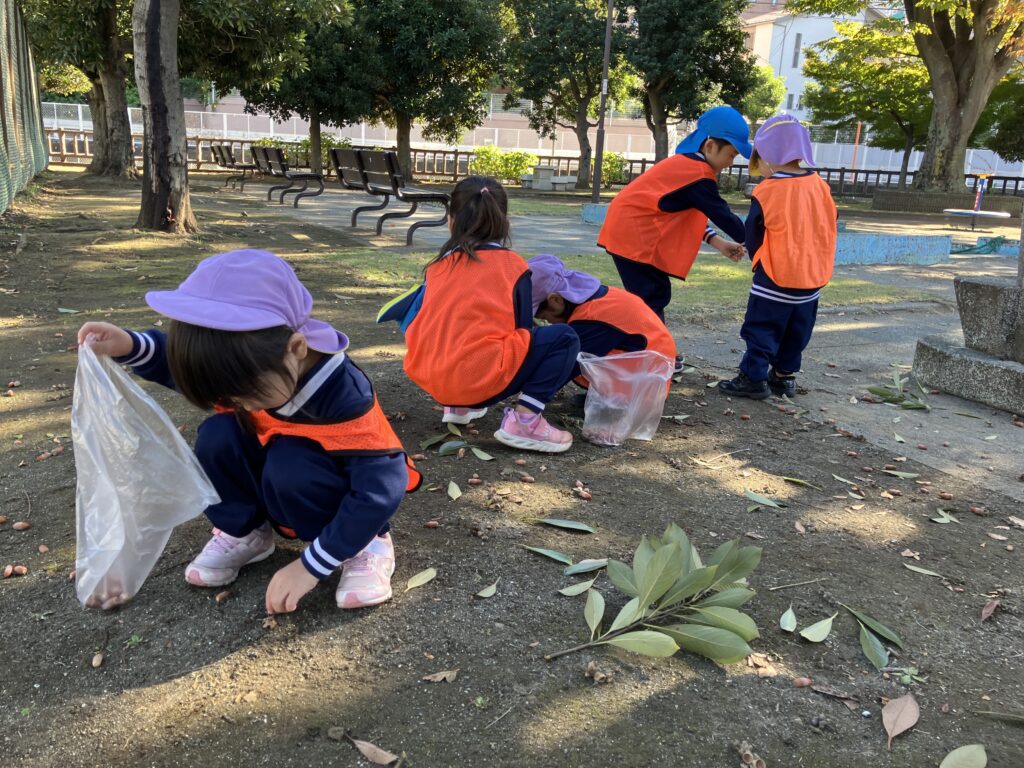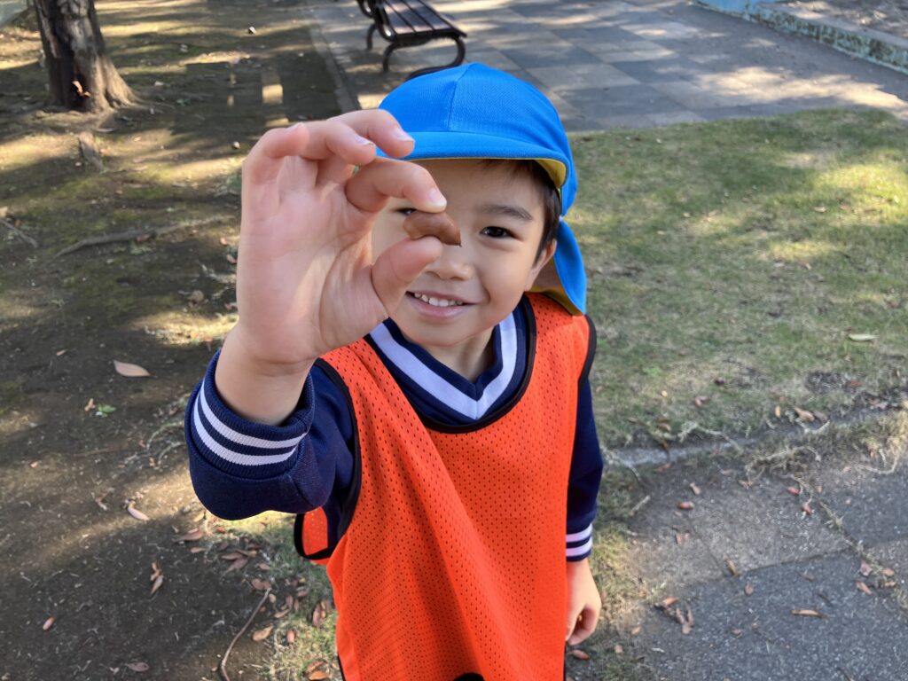 「あったよー!」「こっちもー!」とかわいい声を響かせ、無我夢中で拾うそばで、地域の方が木を揺らしてどんぐりを落としてくれたり、松ぼっくりを渡してくれたり…。優しさにあふれる時間でした。