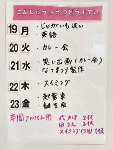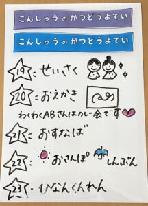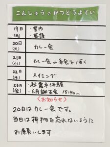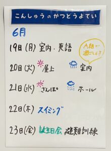 ◆◇1週間の予定◇◆6/19(月)~23(金) 2023/06/17 ※こちらに記載の予定は、天候や都合により変更になる場合がございます。ご承知おきください。 ========================= 【ぽかぽか組】 —————– 【きらきら組】 —————– 【わくわくC組】 —————– 【わくわくB組】 —————– 【わくわくA組】