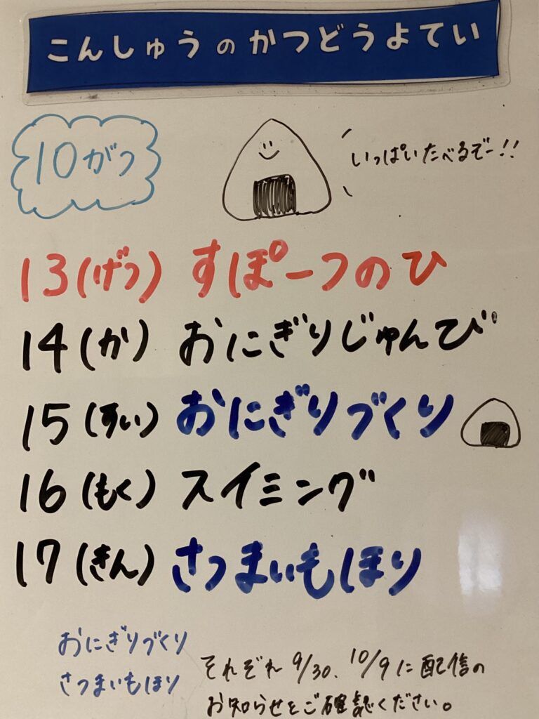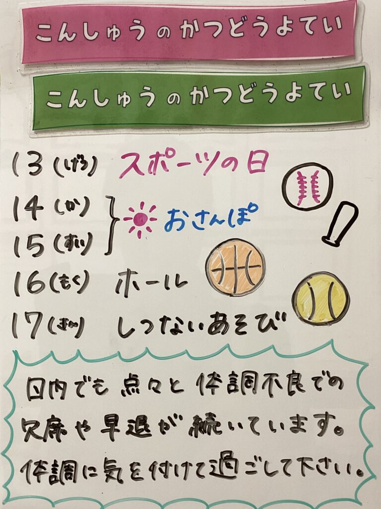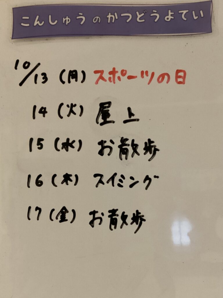 ◆◇1週間の予定◇◆10/13(月)〜10/17(金) 2025/10/11 ※こちらに記載の予定は、天候や都合により変更になる場合がございます。ご承知おきください。 ※コドモンで予定をご確認いただけます。あわせてご活用ください。 ============================= 【ぽかぽか】 【きらきら】 【わくわくC】 【わくわくB】 【わくわくA】
