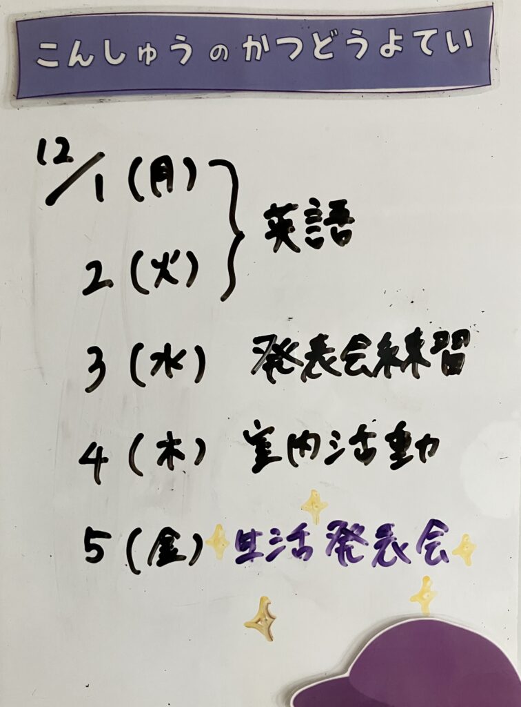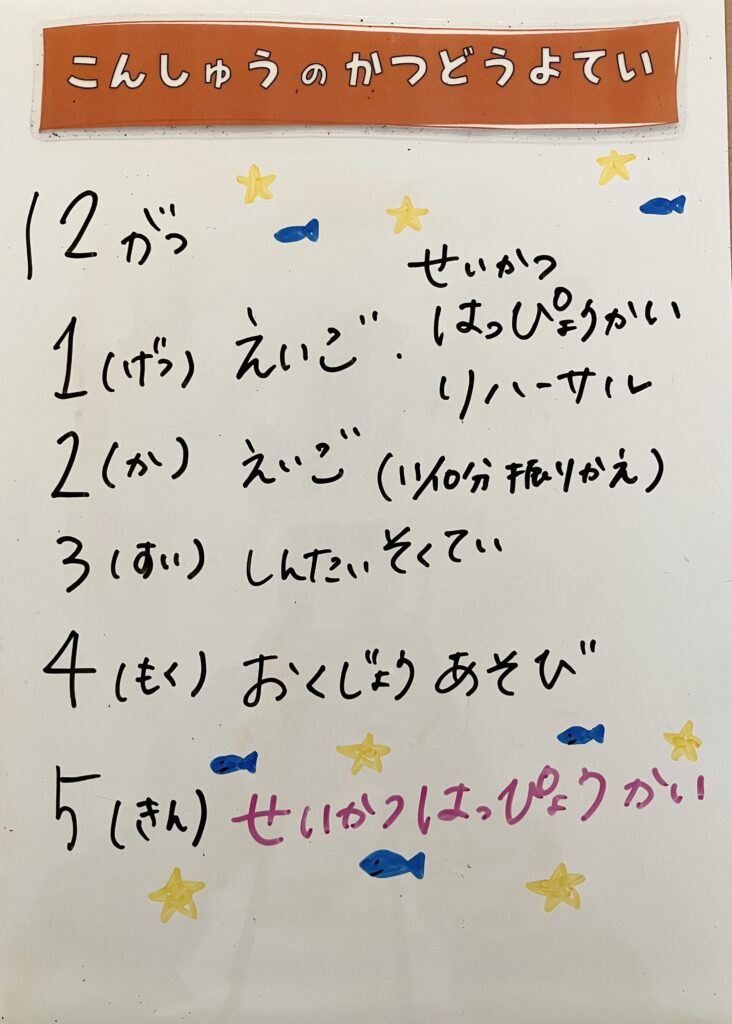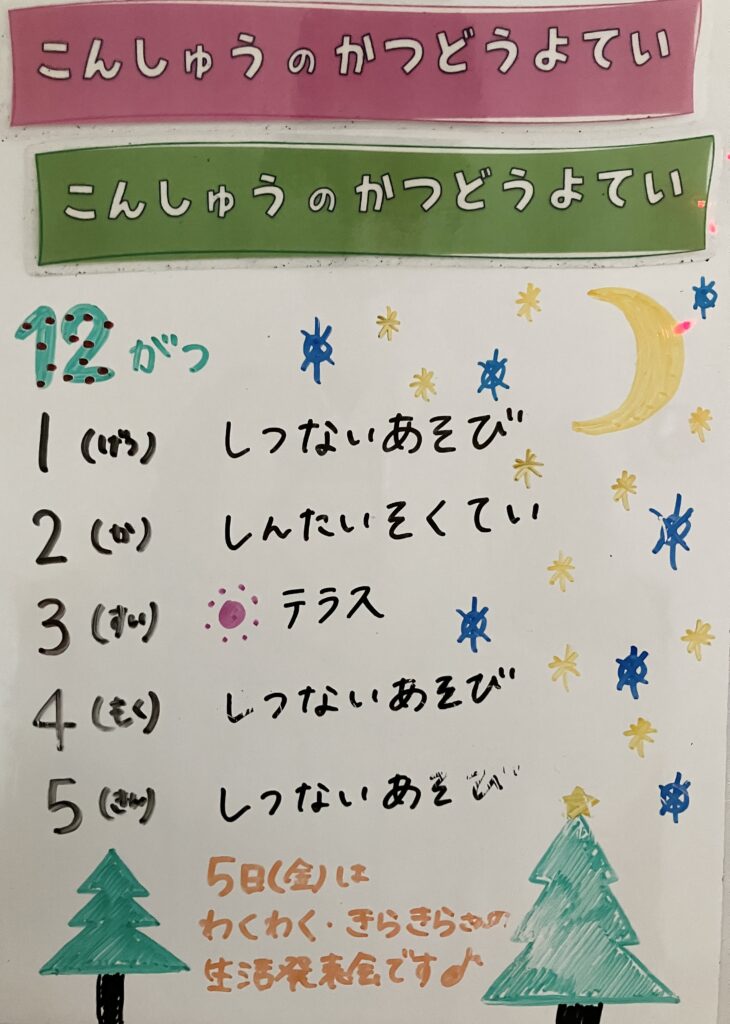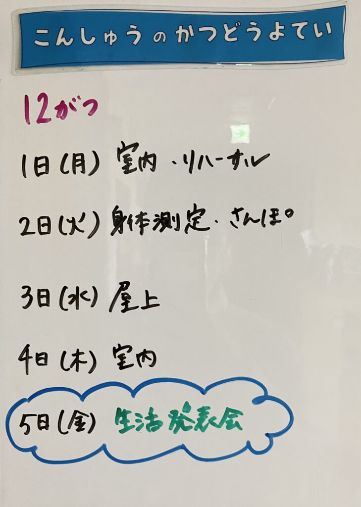 ◆◇1週間の予定◇◆12/1(月)~12/5(金) 2025/11/29 ※こちらに記載の予定は、天候や都合により変更になる場合がございます。ご承知おきください。 ※コドモンで予定をご確認いただけます。あわせてご活用ください。 ============================ 【ぽかぽか】 【きらきら】 【わくC】 【わくB】 【わくA】