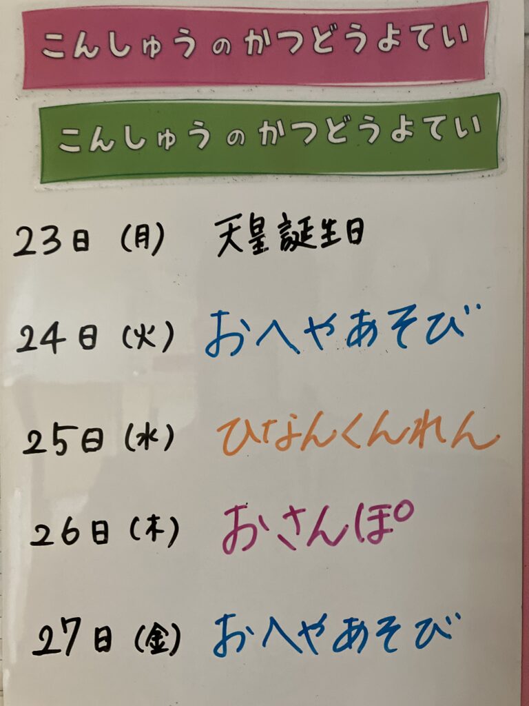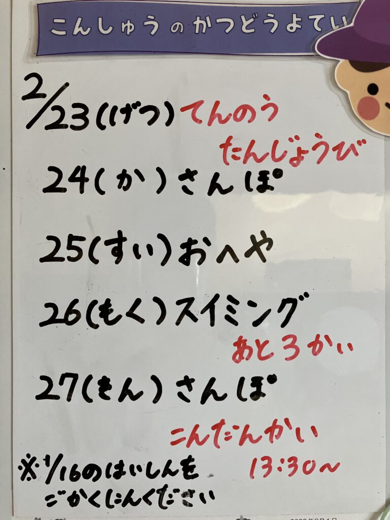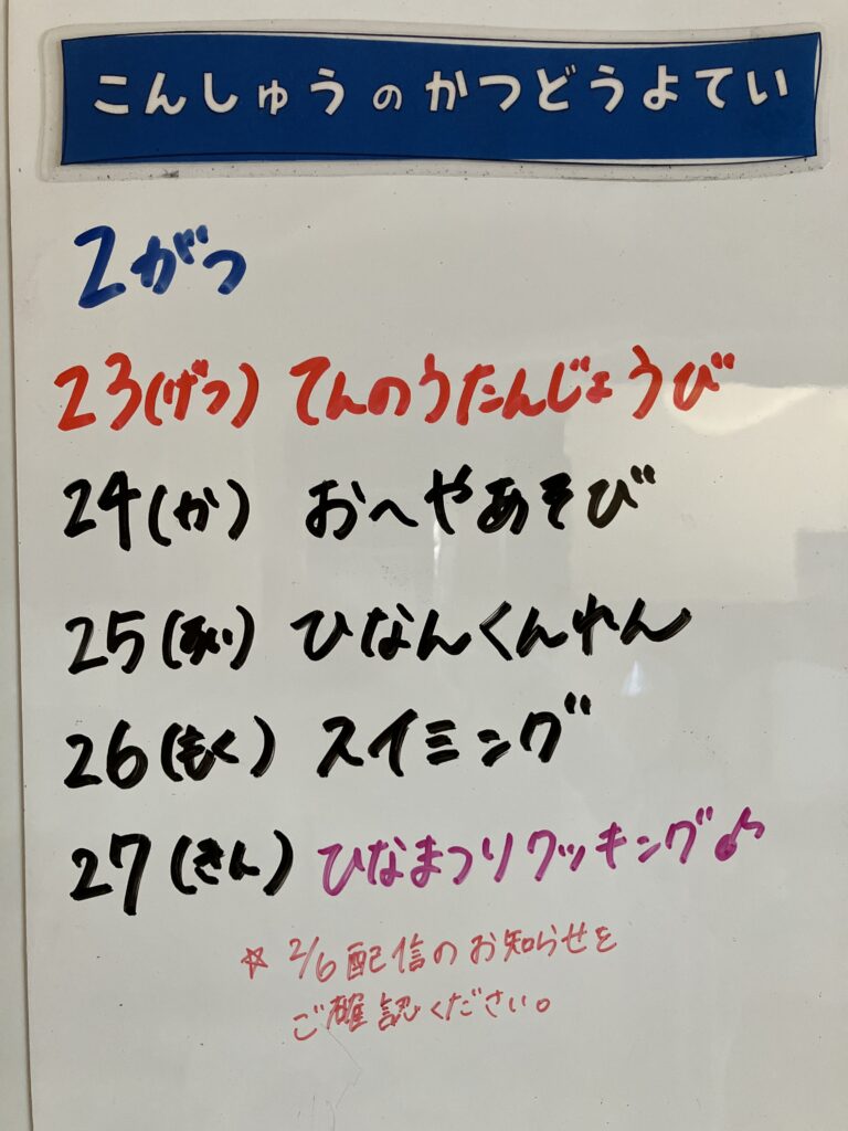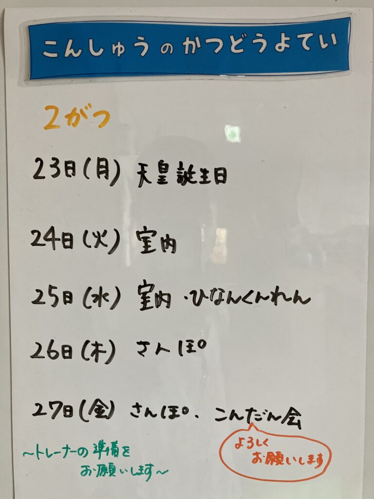 ◆◇1週間の予定◇◆2/24(火)~2/27(金) 2026/02/21 ※こちらに記載の予定は、天候や都合により変更になる場合がございます。ご承知おきください。 ※コドモンで予定をご確認いただけます。あわせてご活用ください。 ================================= 【ぽかぽか】 【きらきら】 【わくC】 【わくB】 【わくA】